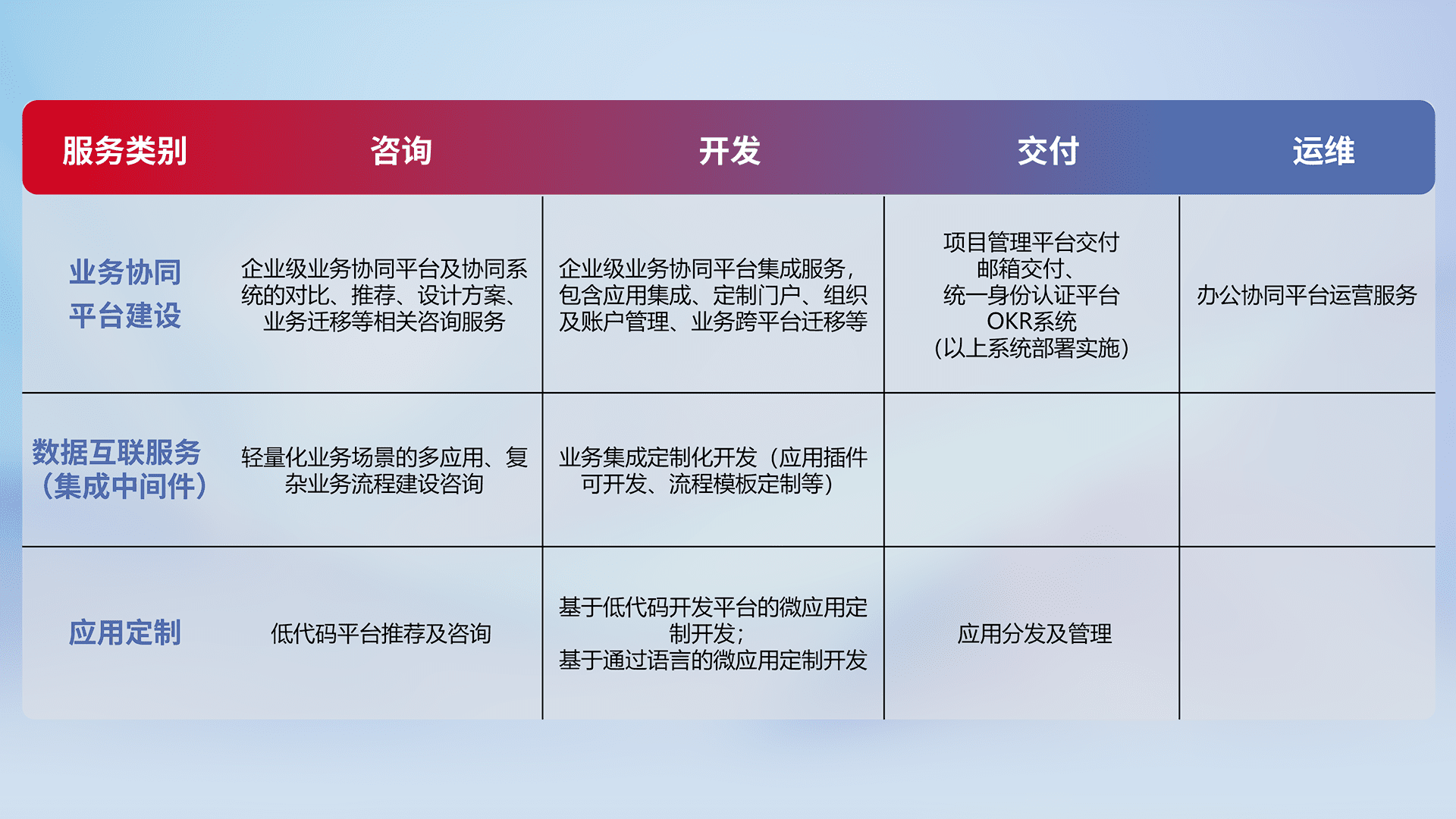 针对钉钉、、、企微、、、、IDaas等平台级产品提供产品的规划、、、、方案、、、交付、、定制化开发等服务,,实现如统一协同办公、、、智能客户服务、、混合会议管理、、智能数据查询、、等业务场景,,,,实现数字化转型。。。。