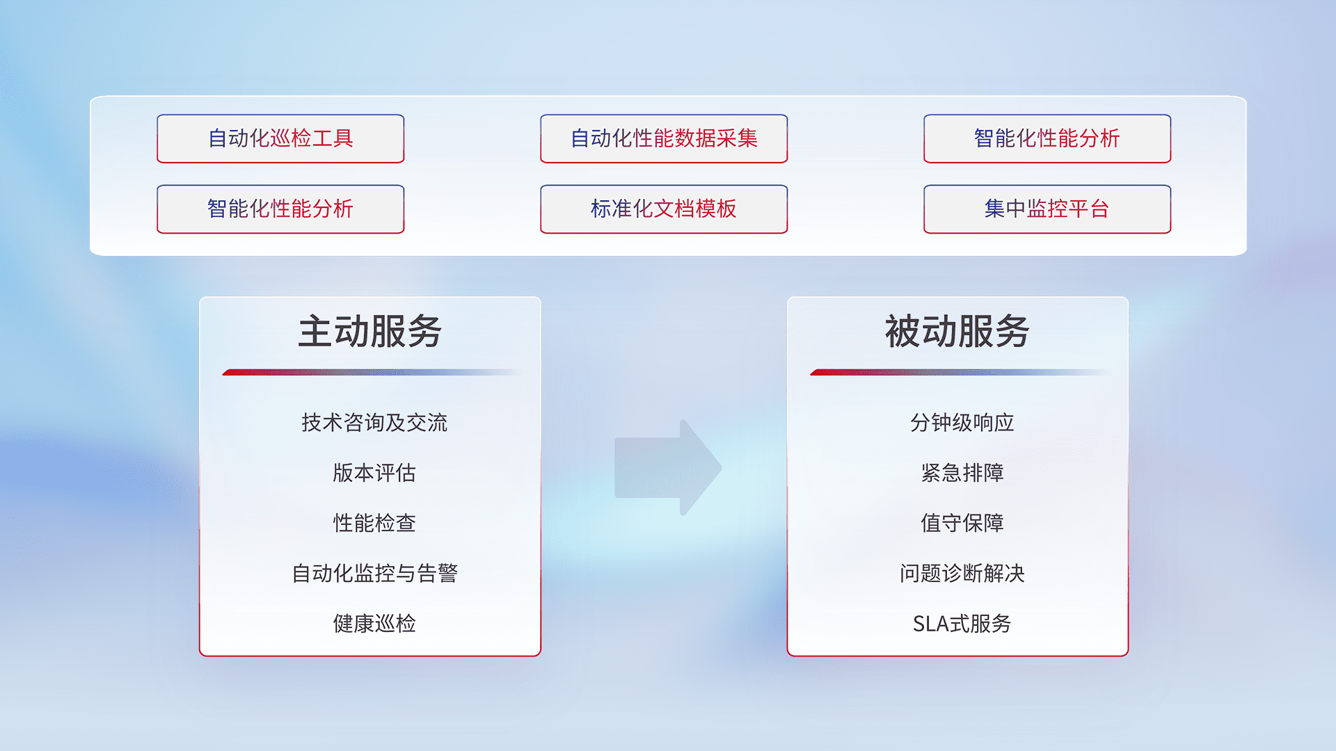 智能化工具和标准化文档,,保障服务质量,,,,提供主动服务(包含技术咨询、、、版本评估、、、、性能检查、、、、自动化监控与告警、、健康巡检)和被动服务包含(分钟级响应、、、、紧急排障、、值守保障、、、问题诊断解决、、、、SLA服务)。。。